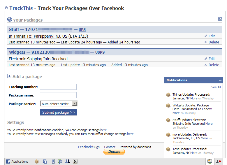 No more refreshing pages. No more wondering if packages have arrived yet. With TrackThis, we'll send you near instant updates via Email, SMS messaging, RSS feeds, iPhone push notifications or Twitter. We track UPS, Fedex, USPS, DHL and several other carriers.